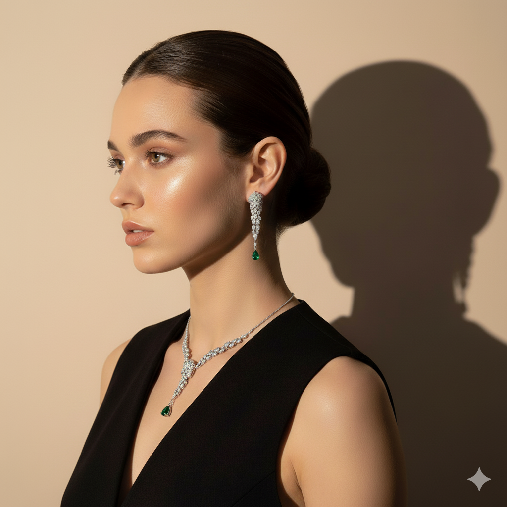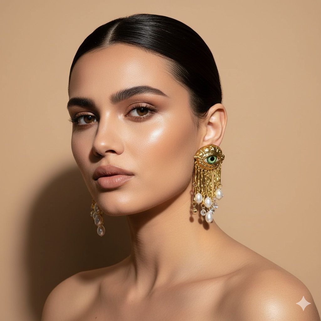 Designed with intricate detailing, these earrings feature an artistic eye motif adorned with dangling pearls and American diamonds. Each piece symbolizes protection and luxury, ideal for those who love unique designer jewelry that speaks volumes.